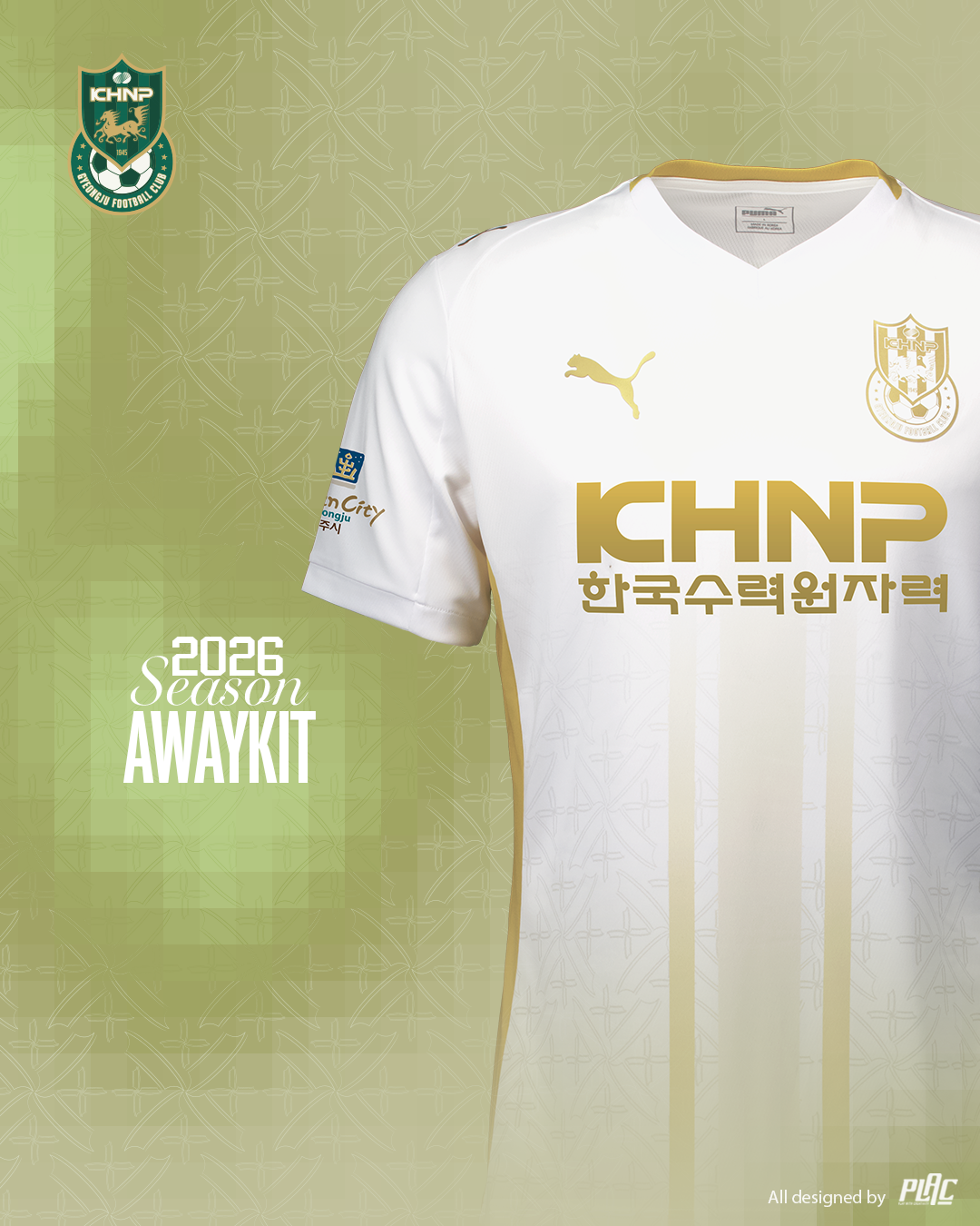 원정 유니폼은 연고지 경주의 정체성과 전통에서 착안했다. 경주의 전통 건축을 상징하는 기와의 실루엣 라인을 패턴으로 활용해, 천 년의 시간을 견뎌온 신라 수도 경주의 역사처럼 흔들리지 않는 뿌리와 자부심을 안고 경기에 임하겠다는 메시지를 담아냈다.