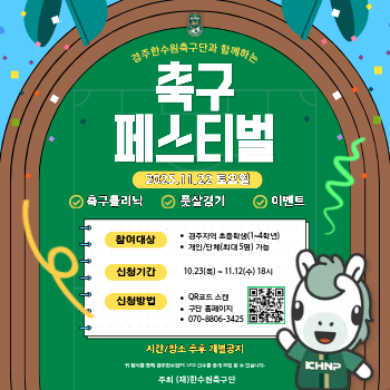 축구 체험·풋살 경기·이벤트 부스 등 다채로운 프로그램으로 지역 소통의 장 마련경주한수원축구단이 지역사회와 함께하는 **‘축구 페스티벌’**을 오는 11월 22일(토) 경주에서 개최한다. 이번 행사는 지역 초등학생들에게 축구의 즐거움을 직접 체험할 기회를 제공하고, 건강한 스포츠 문화 전파를 위해 마련됐다.경주한수원축구단은 K3와 WK리그에서 활약 중인 실업 축구단으로, 지역 밀착형 운영과 유소년 육성에 힘써왔다. 행사 프로그램은 △전문 지도자와 함께하는 축구 클리닉, △ 풋살 경기, △다양한 이벤트 부스 등으로 구성된다.축구 클리닉에서는 드리블·패스·슈팅 등 기본기를 배우며 축구의 기초를 다지고, 풋살 경기에서는 팀워크와 협동심을 경험할 수 있다. 또한 현장에는 구단 홍보 부스, 포토존, 간식차, 이벤트 등 남녀노소 모두 즐길 수 있는 부대 프로그램이 운영된다. 참가 어린이뿐 아니라 가족들도 함께 즐길 수 있어 지역 축제로서의 의미를 더한다. 참가 대상은 경주 지역 초등학생 1~5학년이며, 개인 또는 최대 5명 이내 단체로 신청할 수 있다. 접수 기간은 10월 23일(목)부터 11월 12일(수) 오후 6시까지이며, QR코드 스캔, 경주한수원축구단 공식 홈페이지, 전화(☎ 070-8806-3425)를 통해 가능하다. 행사 세부 일정과 장소는 추후 신청자에게 개별 안내될 예정이며, 당일에는 경주한수원FC 유소년(U12) 선수 공개 모집 안내도 함께 진행된다. 이에 따라 축구에 관심 있는 어린이들에게는 전문적인 유소년 축구의 길을 엿볼 수 있는 특별한 기회가 될 전망이다.행사의 구체적인 시간과 장소는 추후 신청자들에게 개별 공지될 예정이며, 당일 현장에서는 경주한수원FC 유소년(U12) 선수 공개 모집 안내도 함께 이루어질 예정이다. 축구에 재능과 관심이 있는 아이들에게는 자신의 실력을 선보이고 전문적인 유소년 축구의 길을 엿볼 수 있는 특별한 기회가 될 것으로 기대된다.작성 : 대학생마케터 그린이 3기 배수진